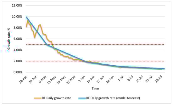 Growth rate over the considered time period in the RF (real-world data and model forecast). Red dotted lines correspond to the growth rates of 5% and 2%.