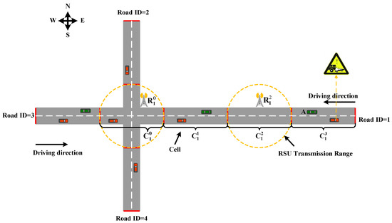We assumed that RSUs have been installed at intersections due to higher traffic density, and information can be propagated in all directions. Hence, we decided to deploy RSUs along the road starting at the intersection. As shown in Figure 1, the road network consists of four two-way lanes with IDs 1, 2, 3, and 4, respectively. Let R be the communication range of RSUs. We partitioned the road into several segments with 2R length starting at the intersection, and each segment is named a Cell. Taking the road with ID 1 as an example, each Cell is numbered from 0 to K in the east direction in Figure 1, such that the first Cell (at the intersection) is numbered 0. Taking the ID information of the road into consideration, we use to represent the first Cell. We selectively fixed RSU at the center of each Cell and denote by the RSU at the first Cell following the denotation of the Cell.