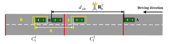 As shown in Figure 2, can’t relay the packet to car B, because car B is not in the communication range of . There are no vehicles in , but we hope that the data packet can be transmitted from A before car A runs into ; the data packet needs to be sent to car B during the time :