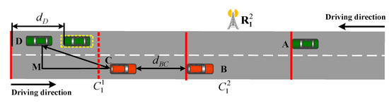 If car B and car C have the same speed as car A, the distance between car B and should be less than 2R. We assume that time meets (6), so car B needs car C as a data repeater to transmit the packet to car D, as shown in Figure 4. Because there is no car in the same direction as Car A in the first half of in the driving direction, once car B runs into , the packet can’t be transmitted from B to D due to the limit on the communication range even if car D stops in the second half of . Thus, we need car C as a data repeater and require that the distance between B and C is less than R. We assume that B and C run at the same speed as shown in Figure 4.