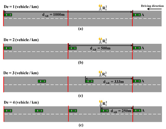RSUs are not required to be deployed when the vehicle density De = 1 and . Because the vehicle density in urban areas is almost 20 vehicles/km regardless of peak or off-peak in Xi’an city, China, we only considered fixing RSUs at intersections due to higher traffic density, and information can be propagated in all directions.