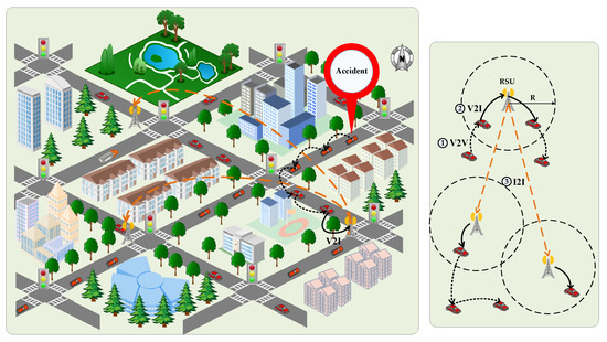 The shortage of traffic infrastructures with the Internet of Things (IoT) and the growing number of vehicles are important reasons for traffic congestion, which has increased travel time and costs of travelers and even caused crashes [1]. V2X (Vehicle to Everything) refers to a combination of vehicles and IoT technology, which includes Vehicle-to-Vehicle (V2V), Vehicle-to-Infrastructure (V2I), Vehicle-to-Pedestrian (V2P), and Vehicle-to-Network (V2N), namely passing information from a vehicle to any entity that may affect the vehicle, and vice versa. Specifically, V2V communication technology is based on a Vehicular Ad Hoc Network (VANET). VANET, which is a vital part of the intelligent transportation system (ITS), can improve road safety and traffic efficiency using wireless communication technology, meanwhile providing various entertainment service information to enhance drivers’ and passengers’ experience while ensure data confidentiality, reliability, and integrity by the data encryption technique [2,3]. VANET, created by applying the principles of mobile ad hoc network (MANET), enables vehicles to spontaneously create a wireless network and relay messages with optional infrastructure support. An infrastructure independent VANET can be constructed spontaneously by a group of mobile vehicles moving nearby without relying on any infrastructure [4]. This type of VANET easily loses messages due to their intermittent connectivity [5]. Another is infrastructure dependent VANET [4], characterized by robust connectivity of infrastructure, such as Roadside Units (RSUs). In the literature, the term RSU refers to a computing device located on the roadside that provides connectivity support to passing vehicles. As the auxiliary communication devices for VANET, RSUs can cope with dynamic topology changes caused by nodes’ fast movement in VANET and effectively improve nodes’ communication quality.