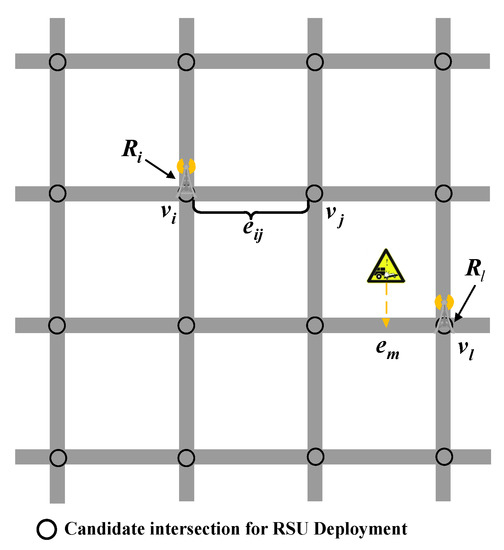 As shown in Figure 8, we assume that an accident occurred on the accident-prone road and the RSU is fixed at in , RSU is fixed at in . A passing car on will relay the data packet including road ID, traffic conditions, and the duration D to other vehicles within its vicinity. Let be the time when received the packet, be the time when received the packet. is less than without considering exceptional cases. When receives the packet, it will disseminate this information to other RSUs via a backbone network. Hence, if an accident occurred on one road, the accident information only needs to be transmitted to the nearest RSU. The objective of this paper is to choose some intersections to deploy RSUs with the given budget, minimizing the average reporting time of emergency messages in the road network of our interest.