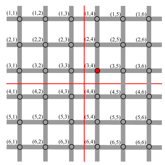 For the deployment of RSUs, the road network is partitioned into four grids using the quartering method as mentioned in center rule (K = 1). Each grid will be deployed at least one RSU according to the central rule. In Section 3.1, we defined a weight for each intersection , likewise, let be the weight matrix of intersections with the same size as . For example, the weight of the intersection (1, 1) in Figure 9 is . The is shown as follows: