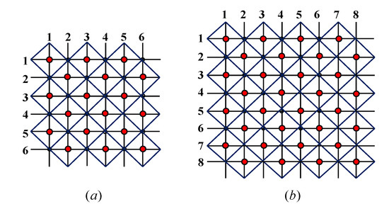 Based on the model in Section 3.1, we first consider the full RSUs coverage problem. For X × X intersections, the solution of RSUD problem is definitive when deploying greater than or equal to X × X/2 RSUs. We can deploy at most X × X/2 + (X − 2)/2 × 4 + 2 RSUs at some of these intersections. For example, the locations of 18 RSUs at 6 × 6 intersections are as shown in Figure 10a, or the figure when we rotate it 90 degrees. If one more is deployed, we can choose these locations at the figure edge such as (6, 1), (1, 6), (1, 2), (1, 4), (2, 1) and so on according to the accident probability of the road associated with these locations. If we deploy one RSU at (6, 1), two roads will be covered. Namely, we need to calculate the sum of the accident probability of two roads associated with (6, 1). In Figure 10a, we can deploy at most (6 − 2)/2 × 4 = 8 RSUs. Or as shown in Figure 10b, if we deploy greater than 32 RSUs at 8 × 8 intersections, we can directly determine these RSUs locations.