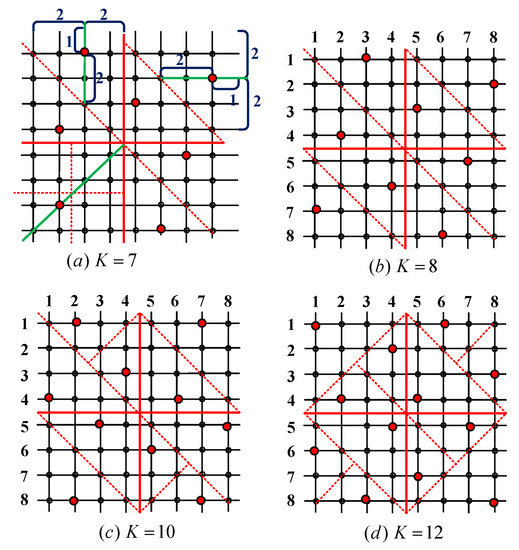 When deploying five RSUs, we will deploy two RSUs in the grid with the largest . For K = 6, we deploy two RSUs in the two diagonal grids with the largest sum of (), which makes the layout of RSUs symmetrical. When K = 7, we will deploy two RSUs with largest () in another two on the conditions of K = 6, as shown in Figure 14a.