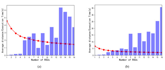 Distance/execution time (bar) changes over the number of Roadside Units (RSUs): (a) 8 × 8 intersections; (b) 12 × 12 intersections.