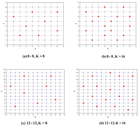Roadside Units Deployment (RSUD) schemes obtained by Center-Rule-Based Neighborhood Search Algorithm (CNSA): (a) 8 × 8 intersections, 8 RSUs; (b) 8 × 8 intersections, 16 RSUs; (c) 12 × 12 intersections, 8 RSUs; (d) 12 × 12 intersections, 16 RSUs.