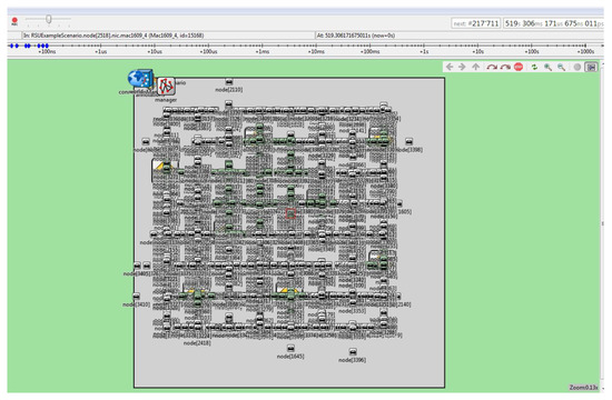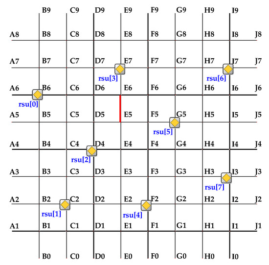 As shown in Figure 18, OMNET++ extracts traffic information (such as road network, traffic lights, and routes) from SUMO by TraCI (Traffic Control Interface). Each vehicle generated by SUMO is modeled as a connected car including three modules (mobility layer, application layer, and network interface card layer) in Veins. Veins also modeled RSU with the same structure as a connected car. Unlike cars, the mobility layer of RSU defines a static mobility pattern (meaning only a position, no movement). Their behaviors defined by application layer are also different. In our simulation, we changed C++ code in the application layer of car and RSU, respectively. We assume that an accident has occurred when a vehicle on a lane stopped for 300 s. The accident vehicle will send a message with lane information to other vehicles or RSUs in the communication range. Once one vehicle receives the message, it will check its route and rearrange another route when its route includes the accident lane and spreads this message only once in the communication range after 5 s plus a random time in (0.01, 0.2). RSU will spread this message after 2 s plus a random time in (0.01, 0.2). We simulated the network with 64 intersections and eight RSUs shown in Figure 17a, and the markers of intersections are shown in Figure 19.