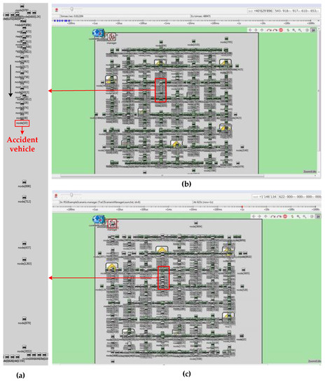 Running interface of the simulation: (a) the accident vehicle on lane E6E5; (b) almost all vehicles have received the message in the connected RSUs scenario; (c) most vehicles have received the message in the disconnected RSUs scenario.
