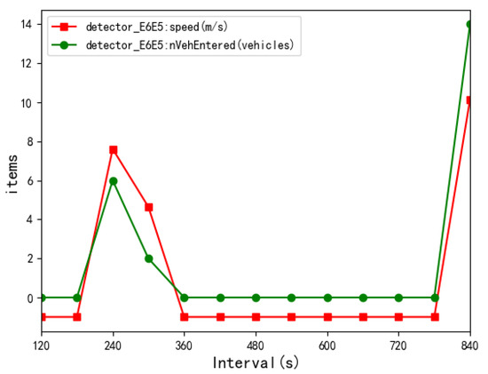 In Figure 22, “speed” means the arithmetic mean of the velocities of all completely collected vehicles (−1 indicate that no vehicles were collected by the detector). “nVehEntered” means the sum of vehicles have touched the detector within the interval. “speed” and “nVehEntered” collected by E1 in three scenarios are same. It can be seen in Figure 21a and Figure 22 that there is no space to allow vehicles to enter the lane E6E5 within the interval (300–360 s). It is obvious that no vehicle entered into the lane E6E5 until accident relief (at 800 s). Therefore, the speed and number of vehicles obtained by E1 on lane E6E5 between the simulation time 300 s and 800 s do not reveal the lane change decision of the vehicle that received the message.