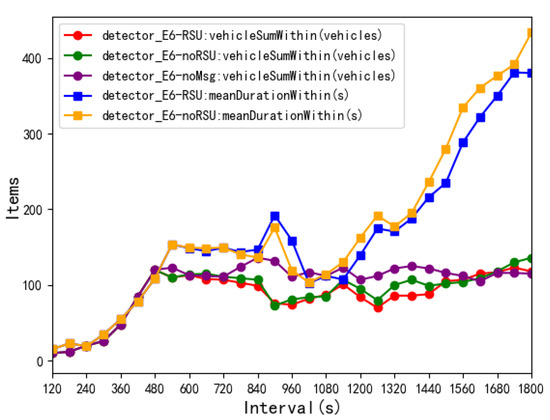 In Figure 23, “vehicleSumWithin” means the number of vehicles that have entered but not yet left the area (8 lanes covered by E3 on the intersection E6). “meanDurationWithin” means the mean duration of these vehicles within the area. The sum of vehicles has entered intersection E6 after 800 s differed in three scenarios, which indicates that vehicles have received the message and made the lane change decision. The number of vehicles entered intersection E6 in our connected RSU scenario was the least of three scenarios. We verified that the connected RSU scenario achieved the extensive coverage of the message. The parameter “meanDurationWithin” could also indicate that most vehicles have rearranged their routes in the connected RSU scenario.