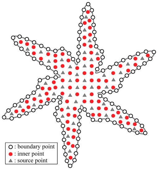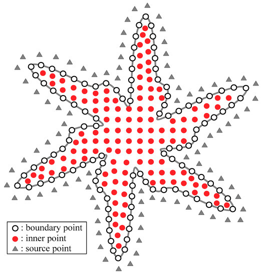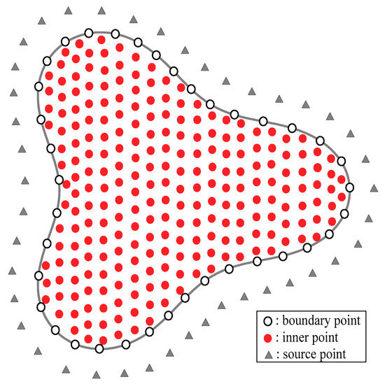 where denotes the known function. Equation (1) can be regarded as a steady-state problem if . The unknown can be expressed using the RBF as