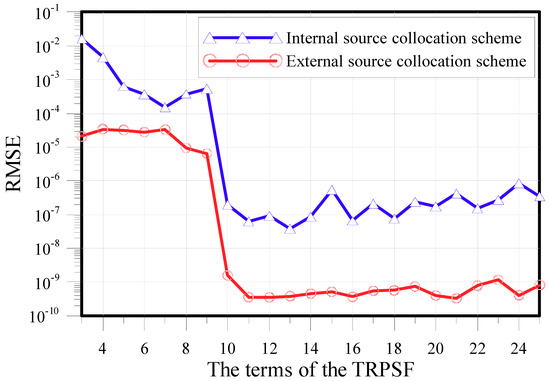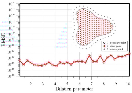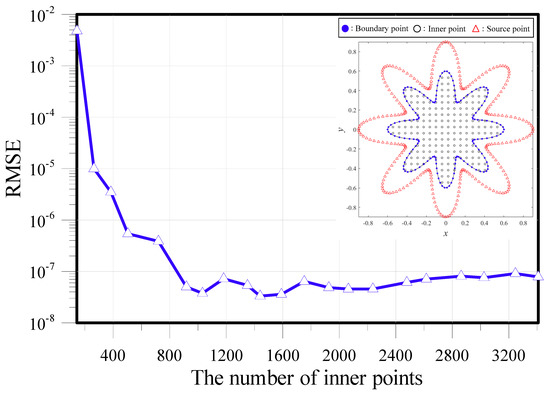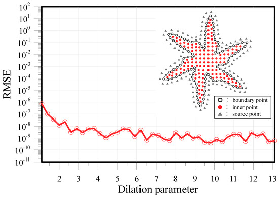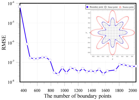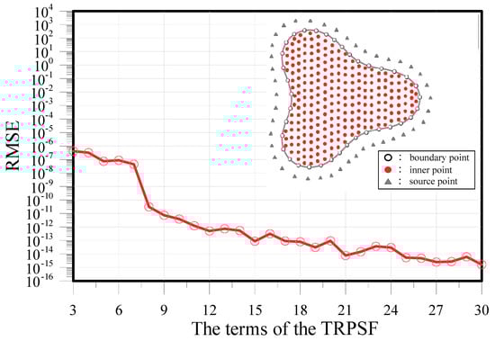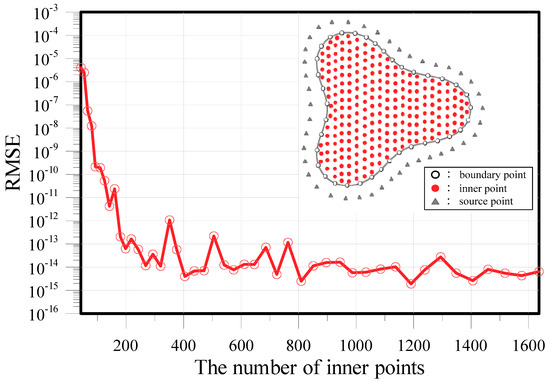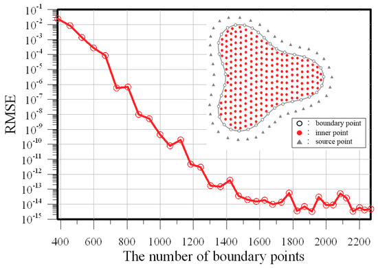 The Dirichlet boundary condition is imposed on the Cassini–shaped domain by using the analytical solution. The layout of the collocation points is presented in Figure 6. Figure 7 depicts the computed results with the analytical solution. The convergence analysis of the presented approach was conducted with different TRPSF terms. Figure 8 demonstrates that the RMSE is decreases as the RPSF terms increase. Highly accurate results could be obtained when the TRPSF terms were greater than 9. Figure 9 presents the dilation parameter versus the RMSE. Similar to that of the previous example, the convergence analysis of the present example demonstrated that the dilation parameter is not sensitive to accuracy. A convergence analysis of the collocation point number was performed. The RMSE decreased as the number of boundary and internal points increased, as presented in Figure 10 and Figure 11. In summary, highly accurate results could be obtained using the proposed method.