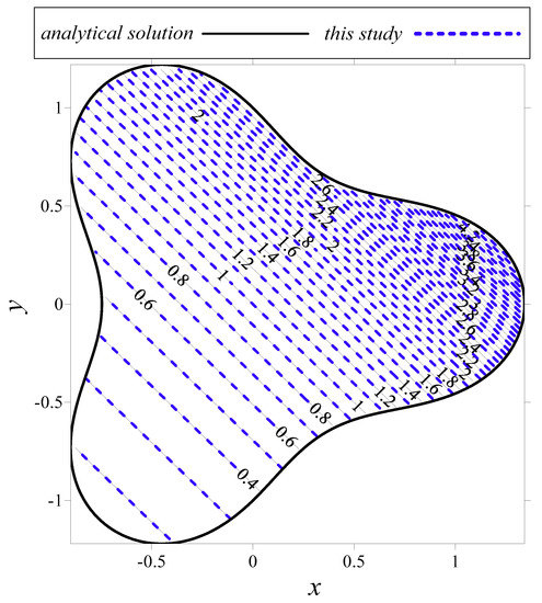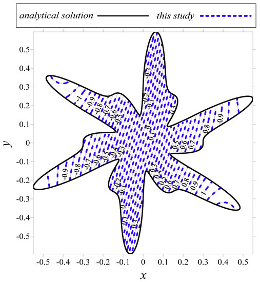 The second example was a stationary problem enclosed by a Cassini–shaped domain, as depicted in Figure 6. The governing equation is as follows: