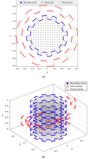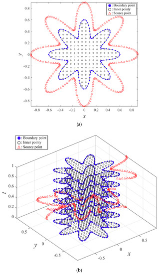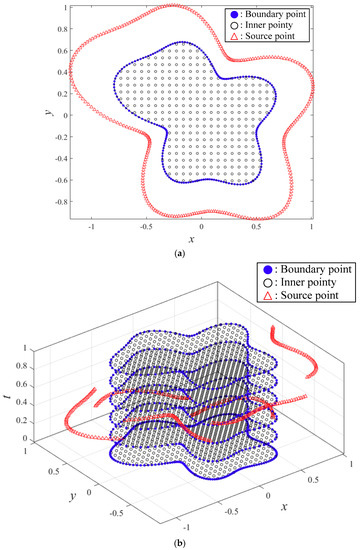 In the numerical implementation, the Dirichlet boundary conditions are provided on the boundary by using the analytical solution. We first examined the accuracy of the position of the sources to the results. Two layouts of possible locations for the source points, depicted in Figure 1 and Figure 2, are called the internal and external source collocation schemes, respectively. For the external source space–time collocation scheme, the sources are collocated away from the domain on the basis of the following equation: