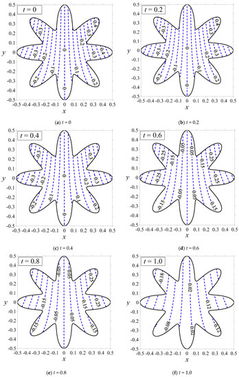 In this case, there are 8 TRPSF terms. The final elapsed time under consideration is from 1 to 5. The numbers of source, boundary, and internal points were 312, 478, and 1392, respectively. The diffusivity coefficient is 1. Figure 12a shows the original two-dimensional problem enclosed by a gear-like shape. Without consideration of the time-marching algorithm, we transformed the domain of the two-dimensional problem into a three-dimensional space–time domain, as depicted in Figure 12b. Table 3 lists the RMSE for dilation parameters ranging from 1.5–6.5 as well as at different elapsed times. Highly accurate results could be obtained in the presented approach.