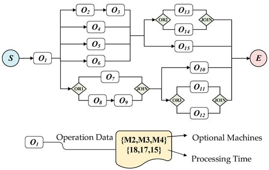 In the figure, the starting point S and the ending point E are virtual nodes, Oi represents the process node, and the process route between OR and JOIN symbolic connection represents the optional process routes, and only one of them can be selected. For example, it can be chose one of the two routes between [O7] and [O8, O9]. Except the optional process route between OR and JOIN, it is necessary to traverse other operation nodes to complete the production of the product. Each operation needs to choose an available processing machine. For the example in Figure 1, a feasible process route plan for the product is: