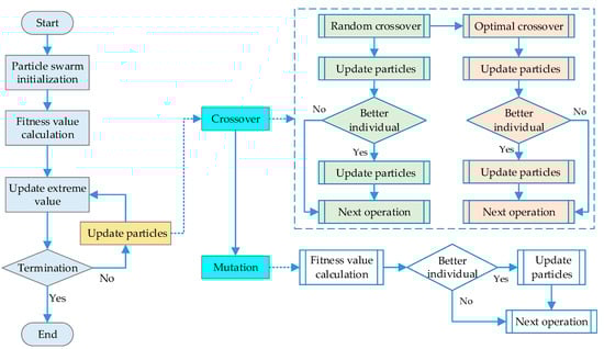 - Random crossover. Cross the particle Indi(i) with other random particles Indi(r), and calculate the fitness value RC_fit(i) of the offspring RC_Indi(i) which is generated by the crossover operation. If a particle with better fitness is obtained, that is, RC_fit(i) is better than fit(i), set Indi(i) = RC_Indi(i), and execute the next step after updating the current particle; otherwise, execute the next step directly;
