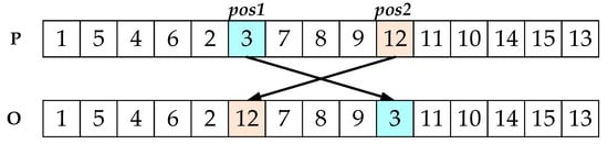 - Exchange the positions of genes in pos1 and pos2 of O;