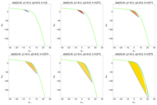 Stability regions in the -plane, for several values of the discretization step h. The boundary of the stability region corresponding to the continuous-time counterpart [8] is represented by green curve.