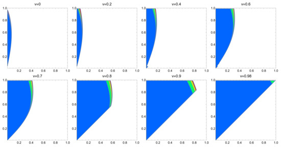 Superposition of stability regions displayed in the -plane for equilibrium states of system (12) (with parameter values: , ), considering several values of the equilibrium membrane potential between 0 and , taking the discretization steps , , and 1, respectively (the smallest region plotted in blue corresponds to the largest step size ).