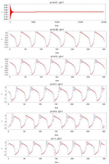 Taking , , , and as values for the parameters of system (11), the equilibrium potential is . In Figure 3, the evolution of the membrane potential can be observed, taking an initial condition from a small neighborhood of the equilibrium. We considered the value of the fractional order for the recovery variable to be and varied the value of the fractional order corresponding to the membrane potential . A Hopf bifurcation appears to be occurring for a value in the interval as for , we have an asymptotically stable behaviour and for , oscillations can be observed, depicting individual spikes that can be modulated by the fractional order and that complement the dynamic behavior displayed by classical integer order counterpart, as observable in the last image of Figure 3.