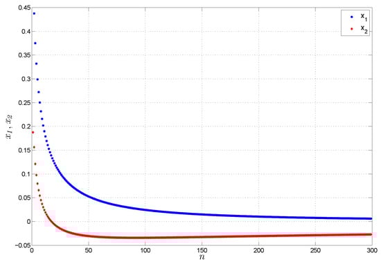 In order to demonstrate the validity of the obtained outcomes, one can observe, from Figure 1, that the two states of system (28) converge to zero, and hence it is stable.