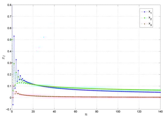 As per Theorem 4, and due to , , then system (28) is asymptotically stable about its zero solution.