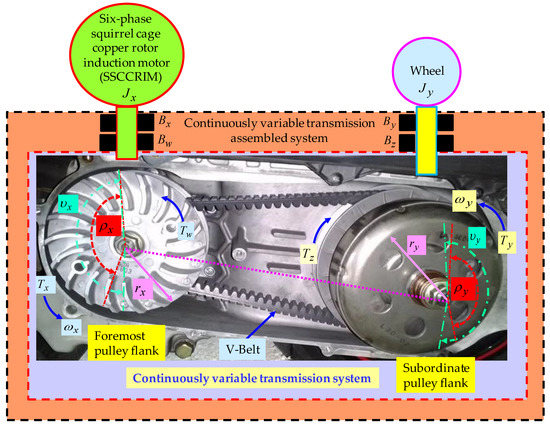 Owing to the effects of nonlinear uncertainties, the SSCCRIM impelled continuously variable transmission assembled system conduced seriously abnormal performance variation in the entire system. The tracking responses of torque and speed control in the SSCCRIM impelled continuously variable transmission assembled system especially deteriorated under nonlinear uncertainties. Therefore, the better models in the SSCCRIM impelled continuously variable transmission assembled system are important in system modelling and control performance. The conformation of the SSCCRIM impelled continuously variable transmission assembled system is shown in Figure 1 [22,26]. Considering that the belt curve effects loss, power loss and sliding loss, which are insignificant in Figure 1, the four drive equations with simplified kinematics of the continuously variable transmission assembled system in the subordinate driven flank and the foremost driving flank by using the law of safekeeping are described as