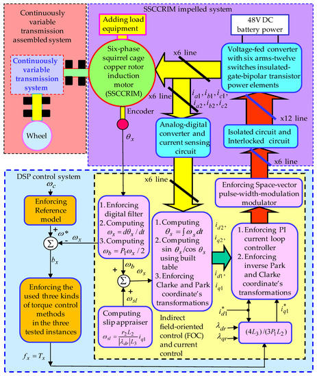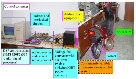 The composition of the SSCCRIM impelled continuously variable transmission assembled system shown in Figure 2 is composed of three subsystems as the SSCCRIM impelled system, the continuously variable transmission assembled system and the digital signal processor (DSP) control system. The continuously variable transmission assembled system is composed of the continuously variable transmission system and the wheel. The SSCCRIM impelled system is comprised of the voltage-fed converter with six arms–twelve switches insulated-gate bipolar transistor power elements, the isolated circuit, the interlocked circuit, the analog–digital converter and the current sensing circuit. The DSP control system can realize a speed control, an indirect field-oriented control (FOC) and a proportional-integral (PI) current control. The indirect FOC is composed of a production, a built table production, a coordinate transformation, an inverse coordinate transformation and a space vector pulse-width modulation control. and are two gains of the PI current control via certain heuristic comprehension [26,27,28] so as to obtain a significant dynamic response. The SSCCRIM impelled system was controlled by the DSP control system under entire nonlinear extrinsic disturbances and entire parameter variations.