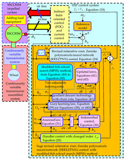 A six-phase induction motor [17,18,19] has been broadly applied in various kinds of industrial applications [20,21] because it has higher efficiency, higher reliability and lower torque ripple in comparison with a three-phase squirrel cage aluminum rotor induction motor. Moreover, the nonlinear dynamics continuously variable transmission systems [22,23] driven by the six-phase squirrel cage copper rotor induction motor (SSCCRIM) that adopted the orthogonal polynomials neural network controls were proposed by Lin [24,25]. However, those control systems with neural networks proposed by Lin [24,25] need longer calculation time to carry out the nonlinear system. Thereby, the main objective and motivation of the proposed sage revised reiterative even Zernike polynomials neural network (SRREZPNN) control with the MFSS method for the SSCCRIM impelled continuously variable transmission assembled system is to develop the RREZPNN control with the cozy learning law, and the indemnified control with an assessed law to reduce computing time as well as speed up convergence of weights in the RREZPNN. This control method has a faster learning ability and better generalization. The SRREZPNN control with MFSS can carry out the handler control, the RREZPNN control with a cozy learning law, and the indemnified control with an assessed law. In accordance with the Lyapunov stability, the cozy learning law for training parameters in the RREZPNN is derived online. Therefore, the RREZPNN with learning ability online can respond to nonlinear uncertainty. Besides, the MFSS is proposed to search for two optimal values to revise two learning rates in the connecting weights and recurrent weights of the RREZPNN and to speed up convergent speed of weights regulation. Finally, tested results are demonstrated to confirm that the SRREZPNN control with MFSS method can reach a fine control performance.