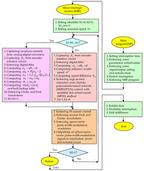 The conformation of the SSCCRIM impelled continuously variable transmission assembled system by using DSP control system is shown in Figure 2. The profile formats of the continuously variable transmission assembled system with conversion ratio as 4.8 are the V-belt length as 652.4 mm, the subordinate pulley diameter as 75.8 mm, the foremost pulley diameter as 34.4 mm. The rated specification of the SSCCRIM is given as six-phase two-poles 48 V, 2 kW, 3452 rpm. The mechanical and electrical parameters of the SSCCRIM are as , , , , , , , . Due to the fixed uncertainty effect in the continuously variable transmission assembled system and the power output limitation in the 48 VDC battery power source, the SSCCRIM impelled continuously variable transmission assembled system is used in 3300 rpm (345.4 rad/s) so as to prevent the insulated-gate bipolar transistor power elements from burning down the SSCCRIM impelled system. Figure 5 is shown in the flowchart of the carried out control method by DSP control system in the experimental tests with real-time implementation that is composed of the main program (MP) and the minor interrupt routine (MIR). The MP realizes all settings and initializations for some parameters and input/output interfaces. The MIR realizes the interrupt process inner 2 ms. The MIR with 2 ms interrupt time processes the following works as capturing six-phase currents from analog-digital converters, capturing rotor position of the SSCCRIM from encoder, computing rotor speed, computing speed difference, enforcing lookup table and coordinate translations, enforcing PI current control, enforcing the proposed control system, and outputting six-phase space vector pulse-width modulation signals to switch the voltage-fed converter with six arms–twelve switches insulated-gate bipolar transistor power elements. Three identifiers b1, b2 and b1_mx are set as 0, 0, and 3, respectively. The DSP control system with the indirect FOC applied the identifier b2 to serve as the enforcing number of the proposed control scheme. If the indirect FOC is enforced in less than three times, i.e., b1<b1_mx, the indirect FOC needs to be enforced repeatedly. When the proposed control scheme is enforced one time and the indirect FOC is enforced three times, then the MIR will return the MP.