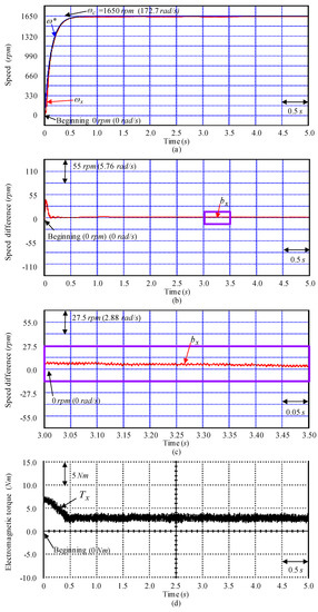 Secondly, Figure 8 and Figure 9 display some experimental results by using the controller CD2 for the SSCCRIM impelled continuously variable transmission assembled system at the examination Y1 instance and at the examination Y2 instance. The speed responses for mandate speed , reference model speed , and gauged speed at two tested instances are shown in Figure 8a and Figure 9a. The speed difference responses at two tested instances are shown in Figure 8b and Figure 9b. The enlargements of speed difference responses at two tested instances are shown in Figure 8c and Figure 9c. The electromagnetic torque responses are shown in Figure 8d and Figure 9d. Figure 8a at the examination Y1 instance demonstrated better speed tracking performance because small disturbance is the same with the rated instance. Figure 9a demonstrated better speed responses owing to the online adjustable method of the MRRHPNN control system with MGWO and the compensated controller action. Moreover, Figure 8d and Figure 9d in the electromagnetic torque responses demonstrated middle torque ripple because of large nonlinear action in the continuously variable transmission assembled system.