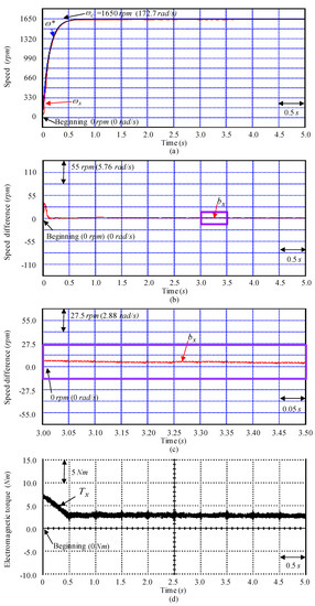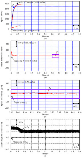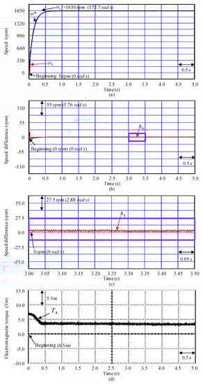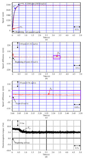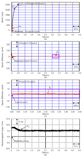 Tested instances with experimental results obtained by using the controller CD3 for the SSCCRIM impelled continuously variable transmission assembled system obtained at the examination Y1 instance: (a) speed response, (b) speed difference response, (c) enlargement of speed difference response, (d) electromagnetic torque response.