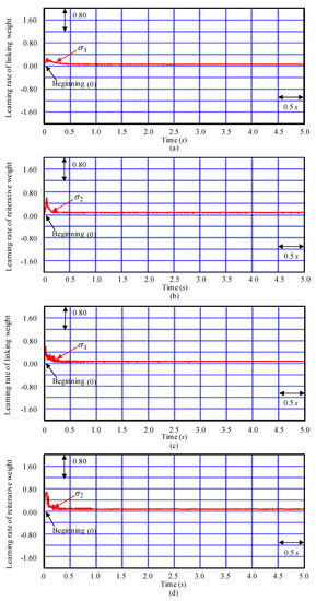 Besides, Figure 12a,b demonstrate the convergent responses for learning rate of linking weight and learning rate of reiterative weight in the SRREZPNN control with the MFSS method as the controller CD3 at the examination Y1 instance, respectively. Figure 12c,d demonstrate the convergent responses for learning rate of linking weight and learning rate of reiterative weight in the SRREZPNN control with the MFSS method as the controller CD3 at the examination Y2 instance, respectively.