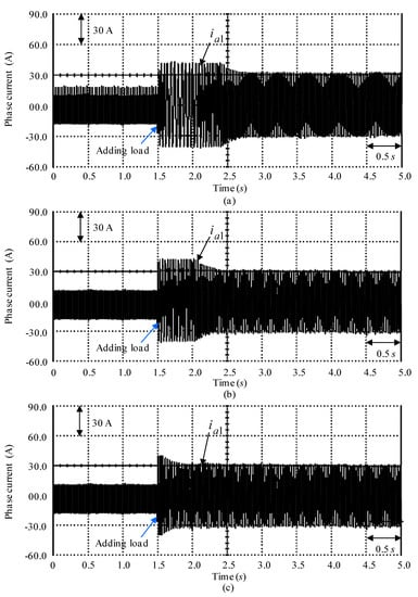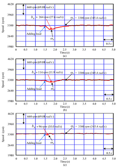 At last, the speed-regulated responses and the gauged phase current responses obtained by using the controller CD1, the controller CD2 and the controller CD3 under adding external load torque disturbance and entire nonlinear extrinsic disturbances at 3300 rpm speed as the examination Y3 instance are shown in Figure 13 and Figure 14. The tested instances with experimental results of gauged speed and gauged phase current at the examination Y3 instance when the controller CD1, the controller CD2 and the controller CD3 are shown in Figure 13 and Figure 14. The speed-regulated responses for mandate speed and gauged speed in the examination Y3 instance case by using the controller CD1, the controller CD2 and the controller CD3 are displayed in Figure 13a–c, respectively. The gauged phase current responses at the examination Y3 instance case by using the controller CD1, the controller CD2 and the controller CD3 are displayed in Figure 14a–c, respectively. The tested instances with experimental results display that the degenerated responses at the examination Y3 instance are fairly improved when the controller CD3 was used. Besides, transient response of the controller CD3 displays better convergence and better load regulation than the controller CD1 and the controller CD2.