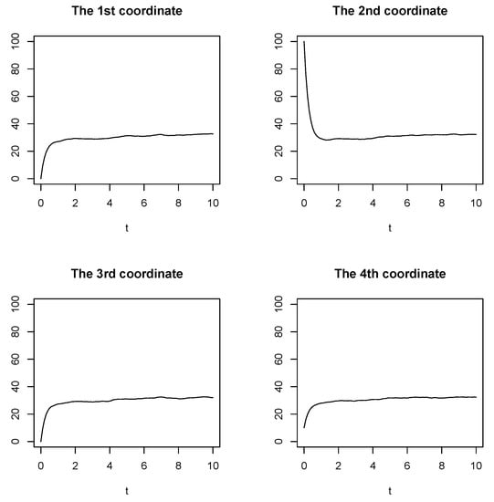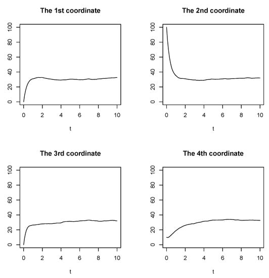 Trajectories of a single realization of the solution to Example (2) with the non-stationary initial condition and are depicted in Figure 4.