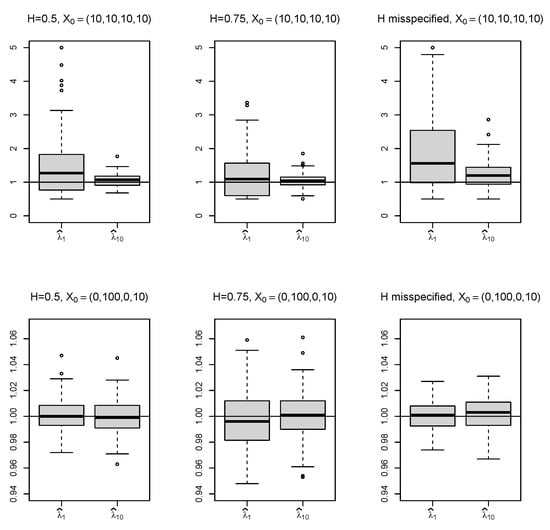 Boxplots of the resulting estimates obtained from the Monte Carlo simulations with 100 independent samples for each scenario are shown in Figure 5 (Example 1) and in Figure 6 (Example 2). The related root mean square errors (RMSE) can be found in Table 1.