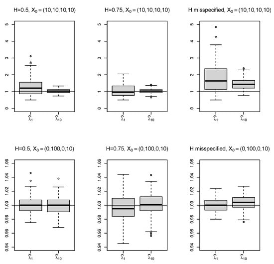 Boxplots of the estimated in Example 1 for time horizons (denoted by ) and (denoted by ) calculated for 100 samples in every case considered; the horizontal line shows the true value of the estimated parameter .