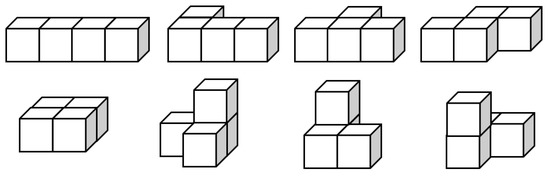 One example of complex tasks offers a well-known research question on cube buildings (among others [26]), a specific variation of polycubes: such a cube building is a structure consisting of connected cubes (). The polycubes’ sequence of the first ten cubes is 1, 1, 2, 8, 29, 166, 1023, 6922, 48311, and 346,543 (http://oeis.org/A000162, 08/13/2020; see also, e.g., [27]). Figure 1 shows the 8 tetracubes as an example.