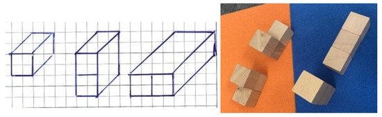 Sebastian (All students’ names are rendered anonymous; personal data which have any identifying factors were removed), a student with attested special educational needs related to learning in general, drew the possible cube buildings of both one and two cubes by hand. He explained (all quotes are translated from German): “With a single cube, there is only one building, you do not put anything else on it. With two cubes, there are only two different cube buildings because the cubes either stand on top of each other or next to each other. With three cubes, you have to think more because the cubes also turn the around corner”. He illustrated his considerations by perspective drawings (without foreshortening the diagonal edges; Figure 3 left). Afterward, he began to build possible cube buildings from three cubes with wooden cubes (Figure 3 right).