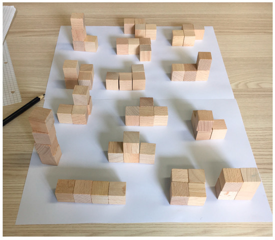 A question for a complex task could be “How many cube buildings can you build with 2, 3, 4, 5, ... cubes?” (e.g., [28]). This complex question combines aspects of spatial perception such as orientation in space, imagining and dealing with spatial configurations, two- and three-dimensional representations of buildings, or creating and reconstructing building plans with easily accessible number explorations. For primary school children, it makes sense to limit the research assignment to the exploration of the numbers of possible cube buildings that can be built from two, three, or four cubes. Searching for all cube buildings consisting of five cubes becomes rather complex compared to those consisting of four cubes. Of course, this has to be understood in the sense of a fundamentum plus additum, as the exploration of higher numbers of cube buildings should always be open to interested students [29].