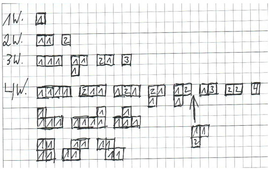 Maria, a student who is assessed to have a very high mathematical potential, worked together with Dimitri, a student who tends to achieve less than average. Following Maria’s suggestion, they completely dispensed enactive approaches or iconic representations; they used construction plans to systematically discover all possible cube buildings with one, two, three, or four cubes (Figure 5), i.e., they turned to a formal-symbolic representation since the building plans correspond to a ground-plan perspective. It is made up of squares, which indicate how many cubes are stacked on top of each other in each position.