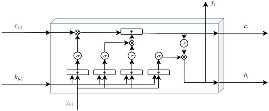 where is the sigmoid function, which is an activation function that converts an input value into a value between 0 and 1. Moreover, is the function that converts the output value to a value in the range of −1 to 1. Then, the value can be used to determine which specific information should be excluded or retrained. The terms , and denote the input value, hidden value, and cell state, respectively, at time step , respectively; the terms are the hidden value and cell state at time step , respectively. The legends and are pointwise multiplication and addition, respectively. Here, are their input weights; , , , and are their recurrent weights; and , are their biases, which must be determined through learning in training processes.