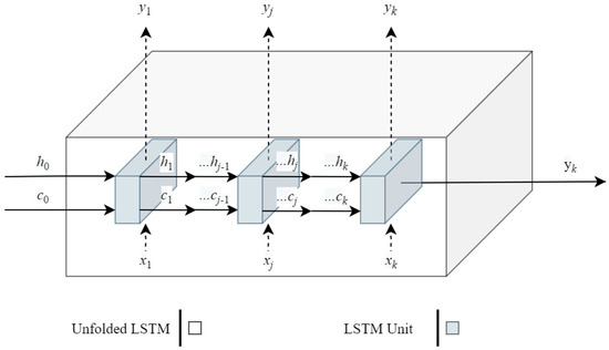 For effective extraction of the temporal relationship between time lags, an LSTM layer was established followed the CNN layer. To address the vanishing gradient concerns of a recurrent neural network, the memory scheme in the LSTM network comprises three gate types: forget gates, input gates, and output gates [24]. The operation of the LSTM is illustrated in Figure 2. Table 1 presents a summary of the parameters used in the LSTM layer.