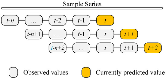 Rolling forecasting is used as a forecasting scheme and for time-order maintenance in time-series models and machine learning models. In this scheme, a fixed window was used, and the value was updated in the fixed window with each newly predicted value. This process involved removing historical data and adding future data so that the fixed window always retained the same amount of time-series data. First in/first out (FIFO) is an updating strategy in rolling forecasting; this type of strategy is referred to as a continuous or recursive strategy. An example of FIFO for rolling forecasting is displayed in Figure 4.
