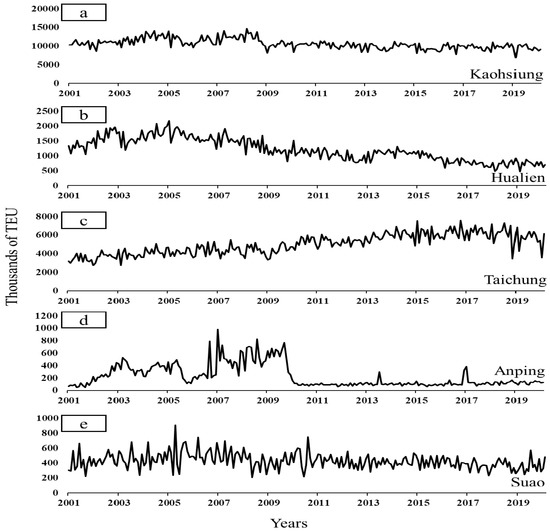 The container throughput data of five ports—Anping, Hualien, Kaohsiung, Taichung, and Suao—in Taiwan were used in the study. The seasonal adjusted monthly levels were retrieved from Taiwan International Ports Corporation. Because of limited data availability, the samples were collected from 2001M1 to 2019M12. Container throughput capacity is defined as the estimated total cargo that can be processed [2]. For containers, it can be expressed as twenty-foot equivalent unit (TEU) containers in a period. The container throughput data are displayed in Figure 5. As illustrated in the figure, the container throughput series of all ports exhibited a different time trend. Kaohsiung port throughput exhibited a steady trend, Hualien, and Suao ports revealed downward trends, Anping port’s throughput grew from 2001 to its peak in 2010, and then returned to similar throughput in 2001.