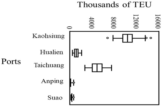 The throughput data are visualized in the form of the box and whisker plots in Figure 6 to present an informative representation of data distribution. In particular, the middle line of the box is the median. The median splits the data set into a bottom half and a top half. The bottom line of the box is the median of the bottom half or Q1. The top line of the box represents the median of the top half or Q3. The whiskers (vertical lines) extend from the ends of the box to the minimum value and maximum value, respectively. The IQR is defined as the distance between the Q1 and Q3: IQR = Q3 − Q1. The data points are considered are outliers if they exceed 1.5 times the IQR below the Q1 or 1.5 times the IQR above Q3. The container throughput of five ports in order is Kaohsiung, Taichung, Hualien, Suao, and Anping. The maximum and minimum, Q1, Q3 mean, median, and outliers for each port are displayed in Figure 6.