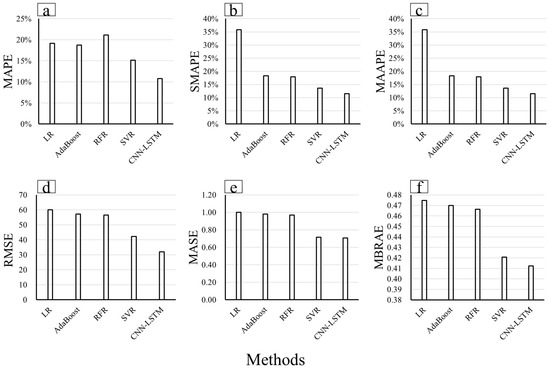 Comparison of the average performance of different models using metrics. (a) MAPE, (b) SMAPE, and (c) MAAPE are percentage metrics. (d) MASE, (e) MBRAE, and (f) RMSE are relative metrics. LR: linear regression, AdaBoost: adaptive boosting, RFR: random forest regression, and SVR: support vector regression units, and CNN–LSTM: convolutional neural network and long short-term memory.